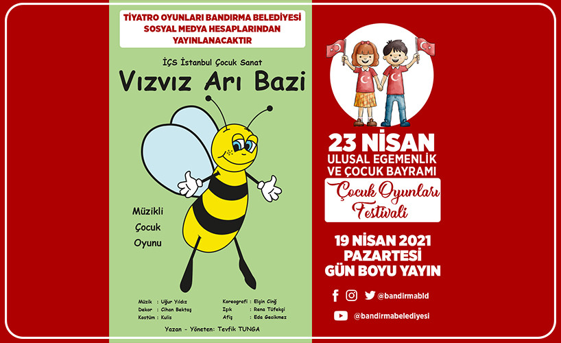 Haydi çocuklar ekran başına! 23 Nisan Ulusal Egemenlik ve Çocuk Bayramı haftasında düzenlediğimiz Çocuk Oyunları Festivali başlıyor. İlk çocuk oyunumuz "Vızvız Arı Bazi" bugün gün boyunca Bandırma Belediyesi sosyal medya hesaplarından izlenebilecek.