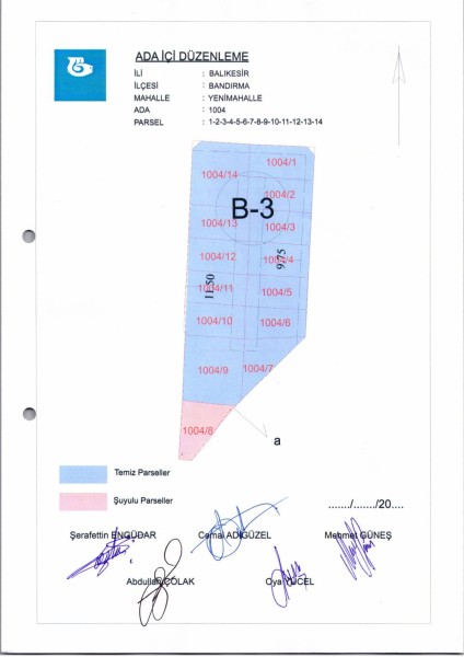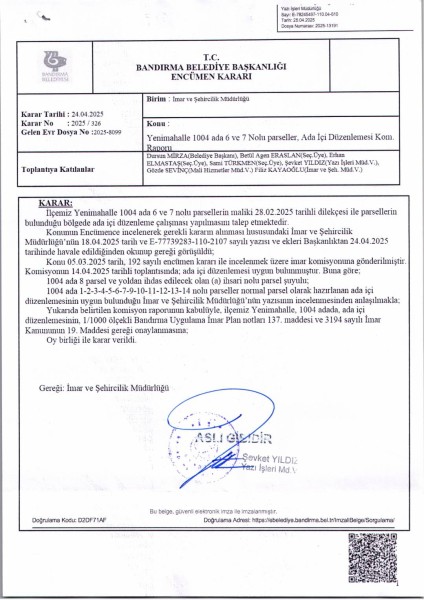 Belediye Encümeninin 24.04.2025 tarih ve 326 sayılı Encümen kararı ile Yenimahalle, 1004 ada 1-2-3-4-5-6-7-8-9-10-11-12-13-14 nolu parsellere ait ada içi düzenlemesinin, 1/1000 ölçekli Bandırma Uygulama İmar Planı notlarının 137. Maddesi ve 3194 sayılı İmar Kanununun 19. maddesi gereği onaylanmasına,