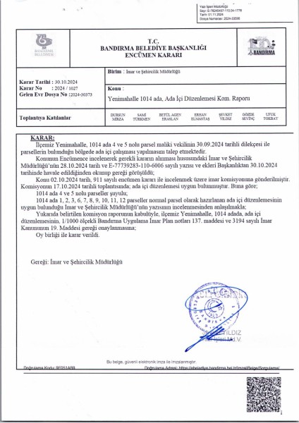 Belediye Encümeninin 30.10.2024 tarih ve 1027 sayılı Encümen kararı ile Yenimahalle, 1014 ada, 1-2-3-4-5-6-7-8-9-10-11-12 nolu parsellere ait ada içi düzenlemesinin, 1/1000 ölçekli Bandırma Uygulama İmar Planı notlarının 137. Maddesi ve 3194 sayılı İmar Kanununun 19. maddesi gereği onaylanmasına,