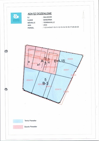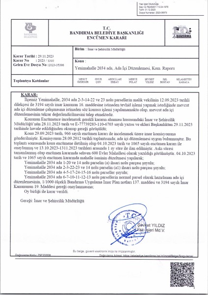 Belediye Encümeninin 29.11.2023 tarih ve 1310 sayılı Encümen kararı ile Yenimahalle, 2034 ada 1-2-3-4-5-6-7-10-11-12-13-14-15-16-17-20-22-23-24 ait ada içi düzenlemesinin, 1/1000 ölçekli Bandırma Uygulama İmar Planı notlarının 137. Maddesi ve 3194 sayılı İmar Kanununun 19. maddesi gereği onaylanmasına,